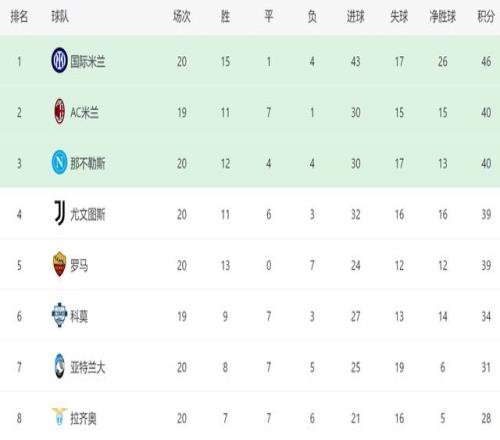 意甲最新积分战报国米8轮不败6分优势领跑那不勒斯追上AC米兰